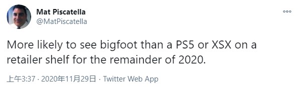 此外,NPD著名分析師Mat Piscatella也發推特稱:在2020年剩餘時間裡,你在零售商的貨架上買到的PS5和XSX很有可能是來自第三方賣家或者野路子手中。